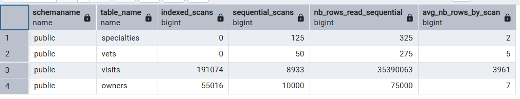 We can see that the owners table has 10,000 sequential scans but they are only reading 7 rows each, on average, so we can expect them to be fast.